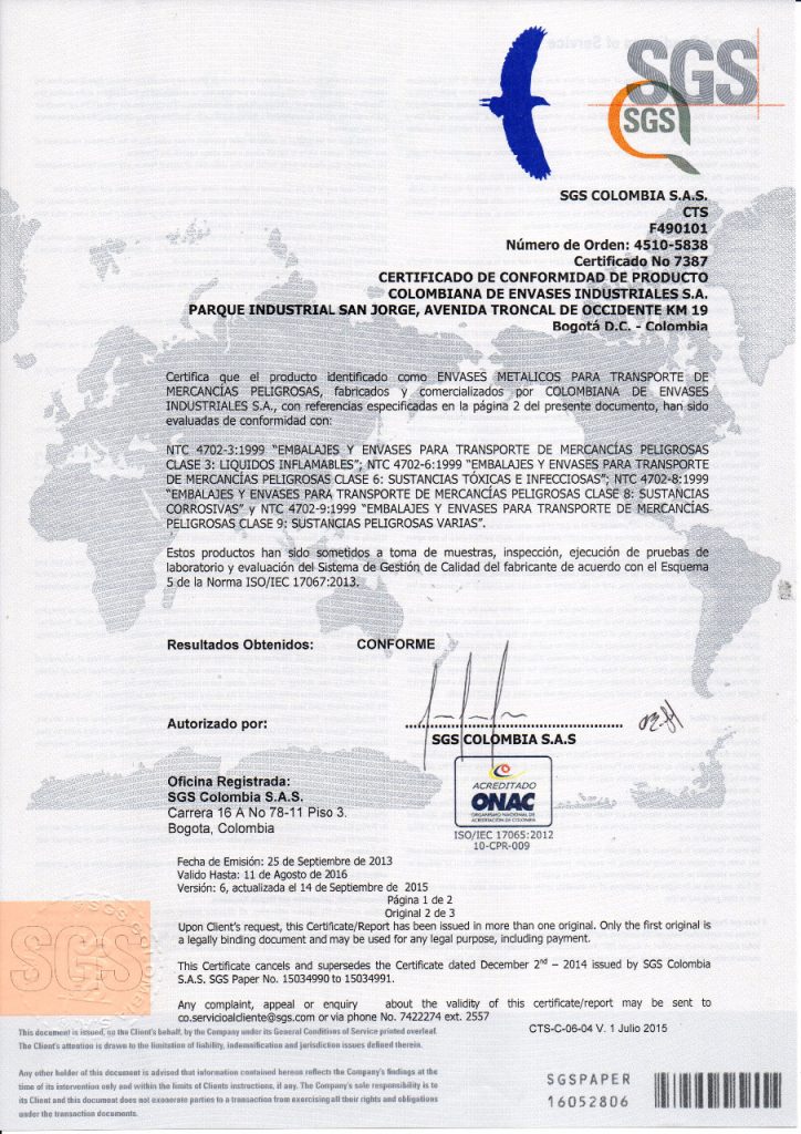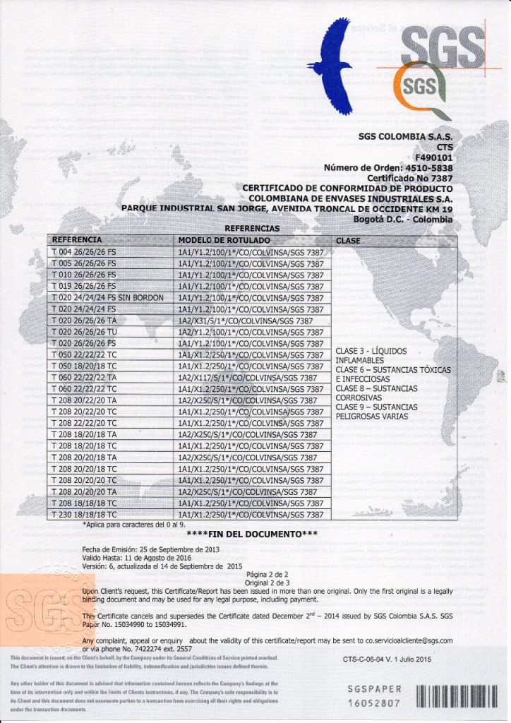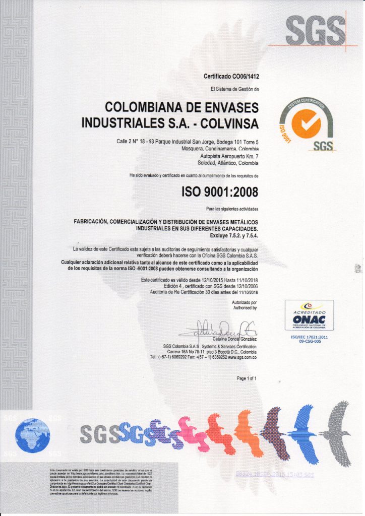 Colvinsa ha sido evaluada y certificada en cuanto el cumplimiento de los requisitos ISO 9001:2008 para las actividades de Fabricación, Comercialización y Distribución de Envases Metálicos industriales en sus diferentes capacidades, en sus plantas de producción de Mosquera-Cundinamarca y Soledad-Atlántico.